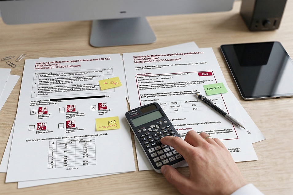 Die Sicherheit Ihres Unternehmens beginnt mit der richtigen Planung. Ein Feuerlöscher an der Wand allein reicht nicht aus, um im Ernstfall Leben zu schützen und Sachwerte zu erhalten. Basierend auf Ihrer Grundfläche und der spezifischen Gefährdungsstufe berechnen wir die gesetzlich vorgeschriebene Anzahl an Löschmitteleinheiten für Ihr Objekt. Dabei wählen wir die optimalen Gerätetypen aus und planen deren strategische Platzierung unter strikter Einhaltung der maximal zulässigen Wegstrecken. Durch unsere fachgerechte Planung und lückenlose Dokumentation sind Sie gegenüber Versicherungen und Behörden rechtssicher aufgestellt. Wir garantieren Ihnen dabei eine wirtschaftlich vernünftige Lösung, die höchste Sicherheit mit funktionaler Effizienz vereint.